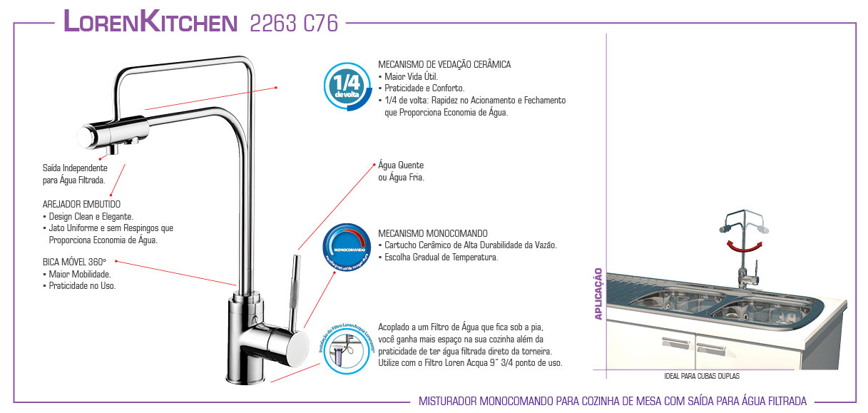 Torneira L orenzetti Misturador Monocomando para Cozinha de Mesa com saída para Água Filtrada